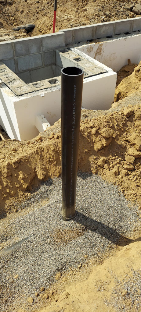 The black PVC pipe being used here is solvent-welded at the joints, ensuring a chemical bond that creates a watertight seal. Cleanouts and vent risers are left exposed above grade for future access.
