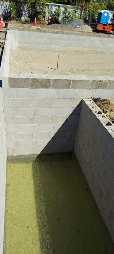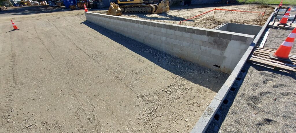 The retaining block walls on each side, shown in the photos, will later be coated with a concrete stucco finish for durability and appearance, while a steel safety railing will run along the top edge to protect workers at grade.