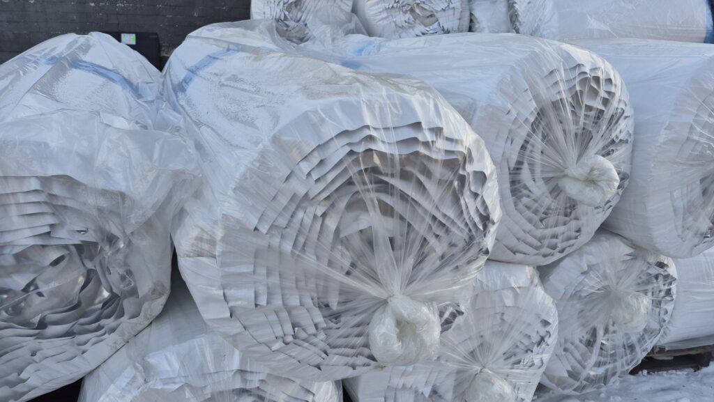 The insulation alone represents a major component of the project. It arrived in two full semi-truck trailers—massive rolls stacked floor to ceiling—and every bit of it will be used. The roof alone covers 18,000 square feet, and the 16-foot-tall perimeter walls add another 8,640 square feet of surface area. In total, the new headquarters will receive approximately 26,640 square feet of insulated coverage. This will make the building more energy efficient, more comfortable for our staff and customers, and better protected against moisture and temperature swings.