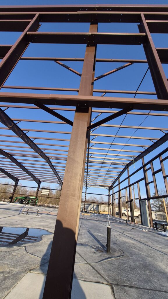 Over the past several weeks, the new Boardsort headquarters has transformed from a concrete slab into a towering steel structure, and we’ve officially reached one of the most exciting stages of the entire build: the full erection of the main frame. The “big iron,” as the crews call it, is now standing proud—rigid frames bolted into place, purlins and girts tied across the bays, and bracing stretched tight to hold everything square. Watching these massive steel columns and rafters go up has been nothing short of incredible.
