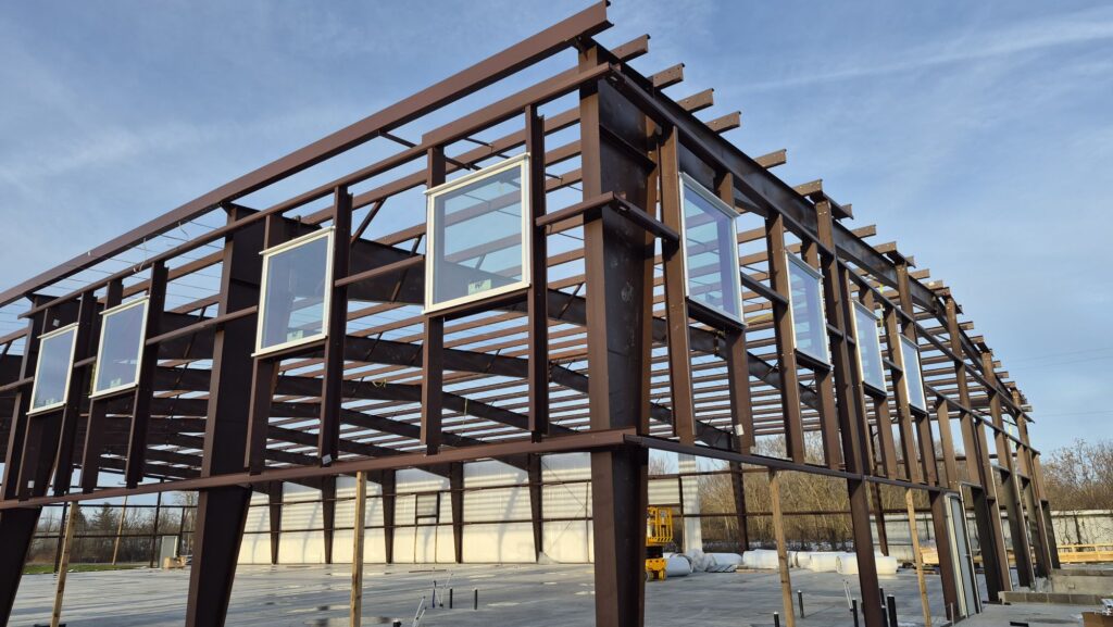 Also in place now are the windows, which will serve the future mezzanine level offices once that structure is built. Even without the mezzanine floor installed yet, these windows already give a clear sense of elevation and scale, adding depth and architectural character to the steel frame. Set high within the rigid steel bays, each window was carefully lifted, aligned, and secured directly into the structural framing, ensuring long-term strength and weather-tight performance.